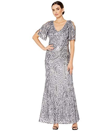 Alex Evenings Langes Spitzenkleid, V-Ausschnitt, Silber